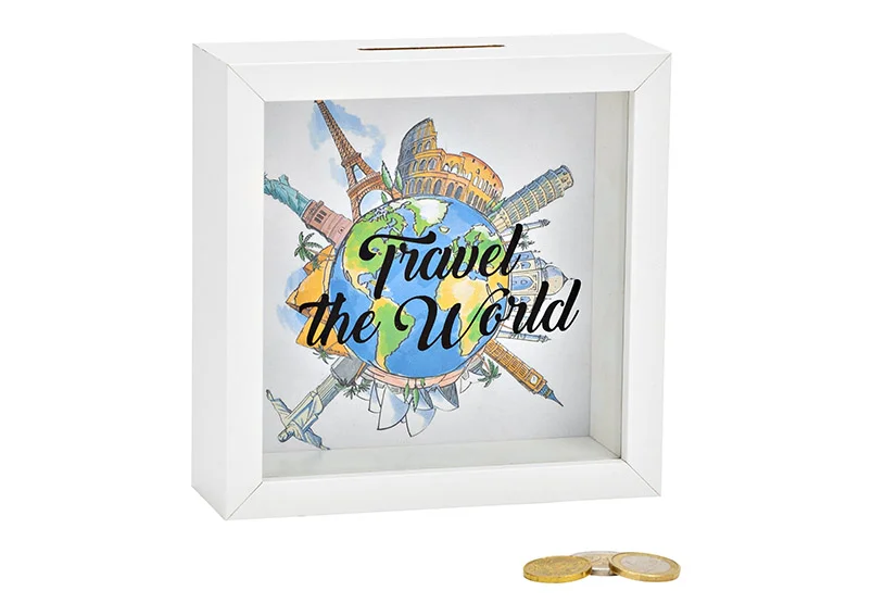 Pokladnička na peníze Travel the World ze dřeva, sklo bílé.